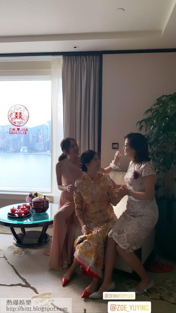 合照完Tim 9秒9離開,此時Jennifer除掉口罩與姊妹團包括妹妹余潔瀅、陳詩欣、鄧穎堯及廖子妤合照。期後她受訪時透露昨晚只睡了2小時:「成日驚唔記得誓詞同要講嘅嘢,所以不停練習。雖然我做幕前,原來人生大事都會緊張,依家仲未簽字,但我好掛住未來老公。(今朝最感動係乜?)媽咪幫我着褂,唔捨得佢,多謝媽咪一直咁錫我。爸爸將我隻手交畀佢(Tim),我都眼濕濕。派利是畀姊妹嘅時候,我同佢哋每個都講祝福語。」