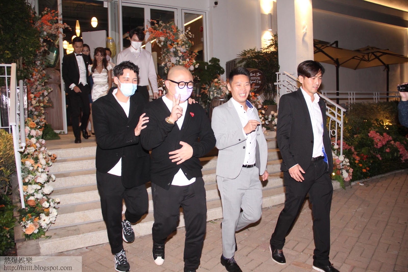 至於一對新人亦在約15分鐘後現身會場大門,向傳媒派發水及利是,並順應傳媒要求拍攝合照。據知眾人仍未盡興,決定散場後繼續派對。而姊妹團之一的蔡思貝則抱着賴慰玲的兒子玩得不亦樂乎,直至賴慰玲丈夫接走兒子方休。