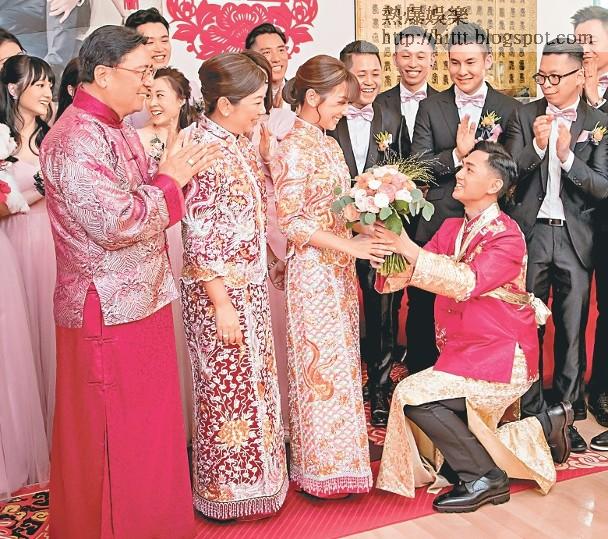 下午他們到沙田一間酒店的戶外園林草地舉行婚禮。約3時,Fred親自駕名車載阿詩到酒店,獲兄弟姊妹團迎接,之後齊齊一字排開影大合照。一對新人以中式禮服現身,穿「褂王」的阿詩行頭強勁,除戴上大串金頸鏈外,還有分量十足的金豬鏈,雙手則佩戴5對超厚身的「流星錘」龍鳳鐲、金戒指及3隻鑽戒,在陽光下金光閃閃。他們應記者要求咀足幾次,Sweet爆全場!