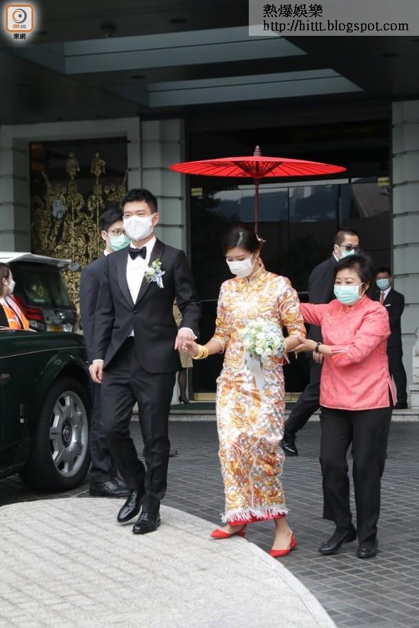 現年27歲的余香凝(Jennifer)與40歲男友陸政渡(Tim)昨日在尖沙咀的5星級酒店舉行婚禮,並設西式午宴,約50名親友出席。昨晨約9時30分,一對新人在大妗姐等陪同下步出酒店門外,被指懷孕的Jennifer穿上裙褂,在Tim拖實下行得小心翼翼,腹部亦微微隆起,又不時以花球遮肚!戴有不少金器的她,與Tim坐花車「行大運」後落車大方任影,但由於新郎怕醜,他倆全程戴口罩,Jennifer更主動出擊:「我哋戴住口罩錫錫」