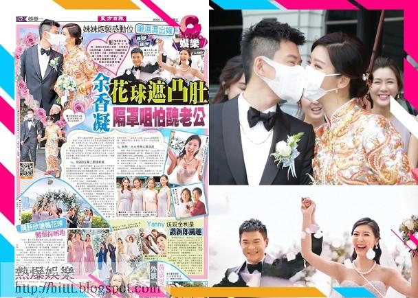 影壇新貴余香凝昨日出嫁,被指已成功造人的她,全程獲老公貼身照顧!見傳媒時,怕醜的新郎哥沒有除下口罩,余香凝則主動隔罩「咀嘴」任影!婚宴上,新郎講出冧爆愛的宣言,難怪獲余香凝讚是爆分好老公。