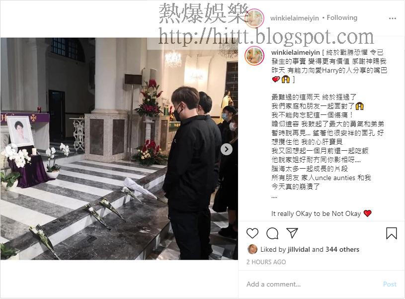 Winkie以「終於戰勝恐懼 令已發生的事實 變得更有價值 感謝神賜我昨天 有能力向愛Harry的人分享的嘴巴」為題,撰寫過千字抒發感受,她在文中以心肝寶貝來稱呼Harry,她又形容亡弟的喪禮是「最難過的兩天」,她與家人及朋友一起面對,對於要瞻仰亡弟的遺容,Winkie指自己要「鼓起最大的勇氣」與Harry暫別,並指亡弟遺容安詳,勾起不少對方生前與自己共處的回憶和成長片段,Winkie坦言自己「真的崩潰了」。