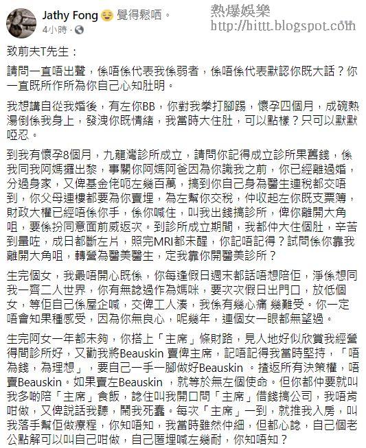 Jathy的FB過去一直不公開,但今早忽然貼出一個「地球post」任人睇,這是一封給前夫T先生的公開信,指自己懷孕4個月時,有人將熱湯倒在她的身上,發洩情緒,「我當時大住肚,可以點樣?只可以默默啞忍。」她又鬧爆前夫未盡過做父親責任:「生完個女,我最唔開心嘅係,你每逢假日周末都話唔想陪佢,淨係想同我一齊二人世界,你有冇諗過作為媽咪,要次次假日出門口,放低個女,等佢自己喺屋企喊,交畀工人湊,我係有幾心痛,幾難受。你一定唔會知嗰種感受,因為你冇良心,呢幾年,連個女一眼都無望過。」