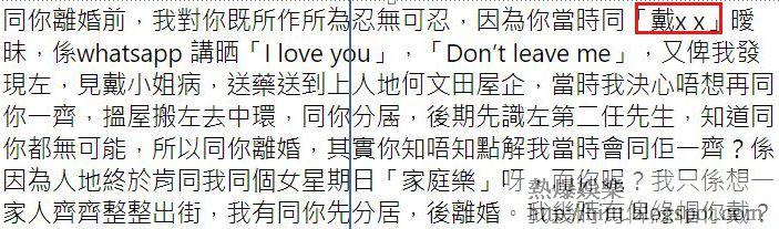 最爆是Jathy暗指跟T先生離婚前,男方先出軌:「同你離婚前,我對你嘅所作所為忍無可忍,因為你當時同『戴夢X』曖昧,喺WhatsApp講晒『I love you』、『Don’t leave me』,又畀我發現,見戴小姐病,送藥送到上人哋何文田屋企,當時我決心唔想再同你一齊,搵屋搬咗去中環,同你分居,後期先識咗第二任先生,知道同你都冇可能,所以同你離婚,其實你知唔知點解我當時會同佢一齊?係因為人哋終於肯同我同個女星期日『家庭樂』呀,而你呢?我只係想一家人齊齊整整出街,我有同你先分居,後離婚。我幾時有畀綠帽你戴?」