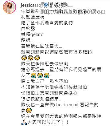 Jessica昨日與Steven已做了檢測,但為剛過去一星期有見過面的朋友擔心,她說:「原本我自己一點也不怕,不知道為甚麼做完檢測後就很怕,也很怕朋友看到新聞會擔心,很想快點知道結果。昨晚也一直在做check email看報告的夢,好在今早我們大家的檢測報告都是陰性,大家可以放心了!希望大家都身體健康!」Jessica還P.S.指:「啲嘢食真係好好味呀!」加上多張食物的相片及與友人的合照,看來這頓晚餐令Jessica今年的生日變得特別難忘呢!