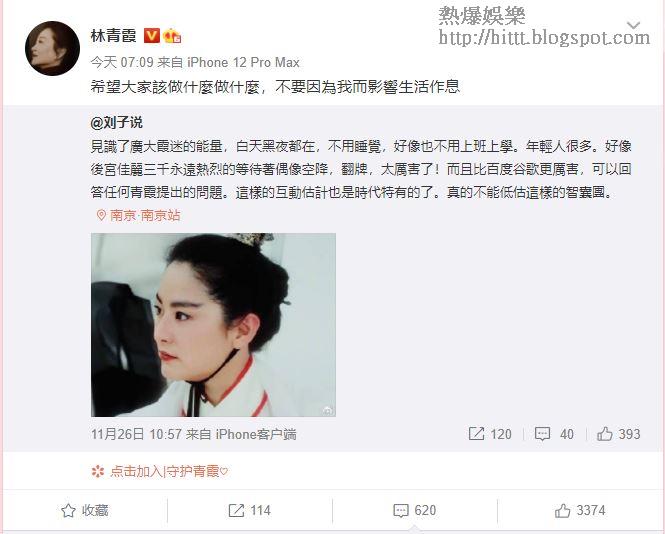 大美人林青霞早前回歸微博後,除了宣傳第三本新書外,亦有和網民分享生活點滴。雖然林青霞今年已66歲,但原來都喜愛夜生活,今日她於凌晨近4點貼出自己舊年去印度旅行的照片,不過青霞出post後並沒有馬上去睡覺,反而是選擇繼續玩微博,仲玩到差不多朝早9點。