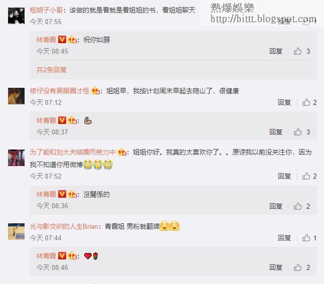 林青霞在早上8點45分回覆完男fans後,便沒有再覆其他人。(微博圖片)