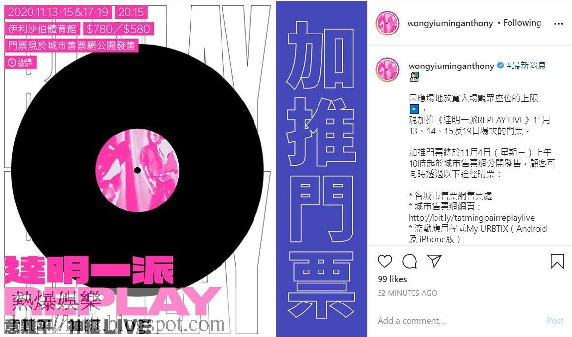 另外,黃耀明今日在網上公佈,達明一派本月中在伊利沙伯體育館舉行的《達明一派REPLAY LIVE》演唱會,因應場地放寬入場觀眾座位的上限,率先宣佈加推13、14、15及19日4場的門票。