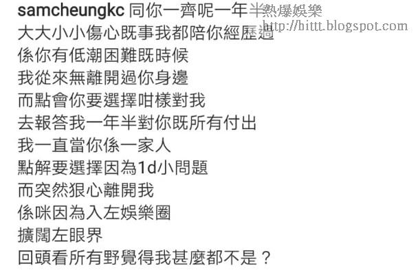 點知事隔10日,Sam今日凌晨突然喺社交網發文自爆被狠飛:「同你一齊呢一年半,大大小小傷心嘅事我都陪你經歷過,喺你有低潮困難嘅時候,我從來冇離開過你身邊,而點會(解)你要咁樣對我,去報答我一年半對你嘅所有付出?我一直當你係一家人,點解要選擇因為一啲小問題而突然狠心離開我,係咪因為入咗娛樂圈擴闊咗眼界,回頭看所有嘢覺得我甚麼都不是?」佢又隨文附上一張兩人互咬食物甜蜜照,不過之後佢已將Post刪走!