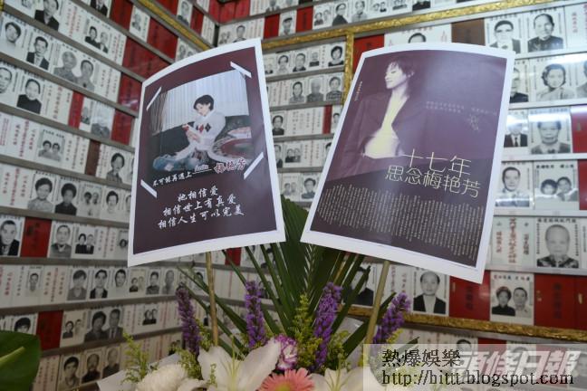 梅姐Fans並冇忘記偶像,今日特別帶備梅姐生前最愛的美食,到九龍塘省善真堂靈位拜祭。中午時份,梅姐靈位前已放滿檸檬茶、咖啡、奶茶、可樂、三文治、杯麵、點心、蛋糕、雲吞及提子等大批美食,還有「梅艷芳國際歌迷會」花牌和果籃及會長蘇小姐送給梅姐的花牌。