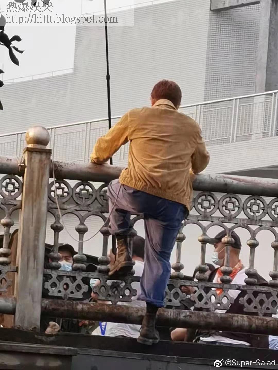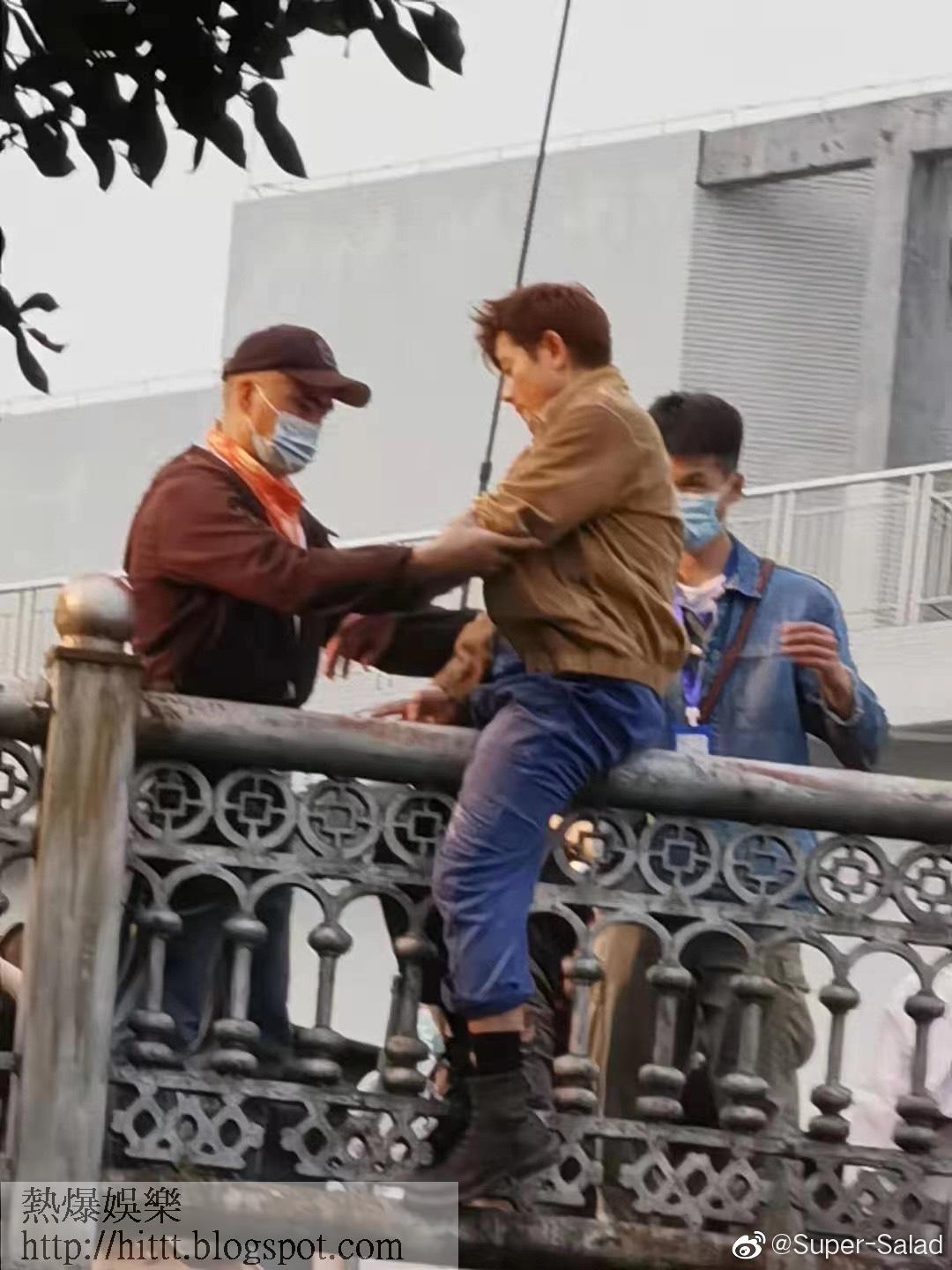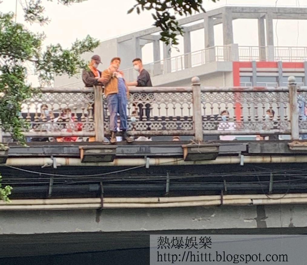 順利爬出橋邊後,踎在檢邊的城城,一手捉實欄杆,另一隻手則抱起白色小狗。救狗後,挨在橋邊的城城則面露餘悸地看着橋下。而貼出相片的網民就留言表示今次是第一次現場看城城拍戲,覺得他「好敬業」。