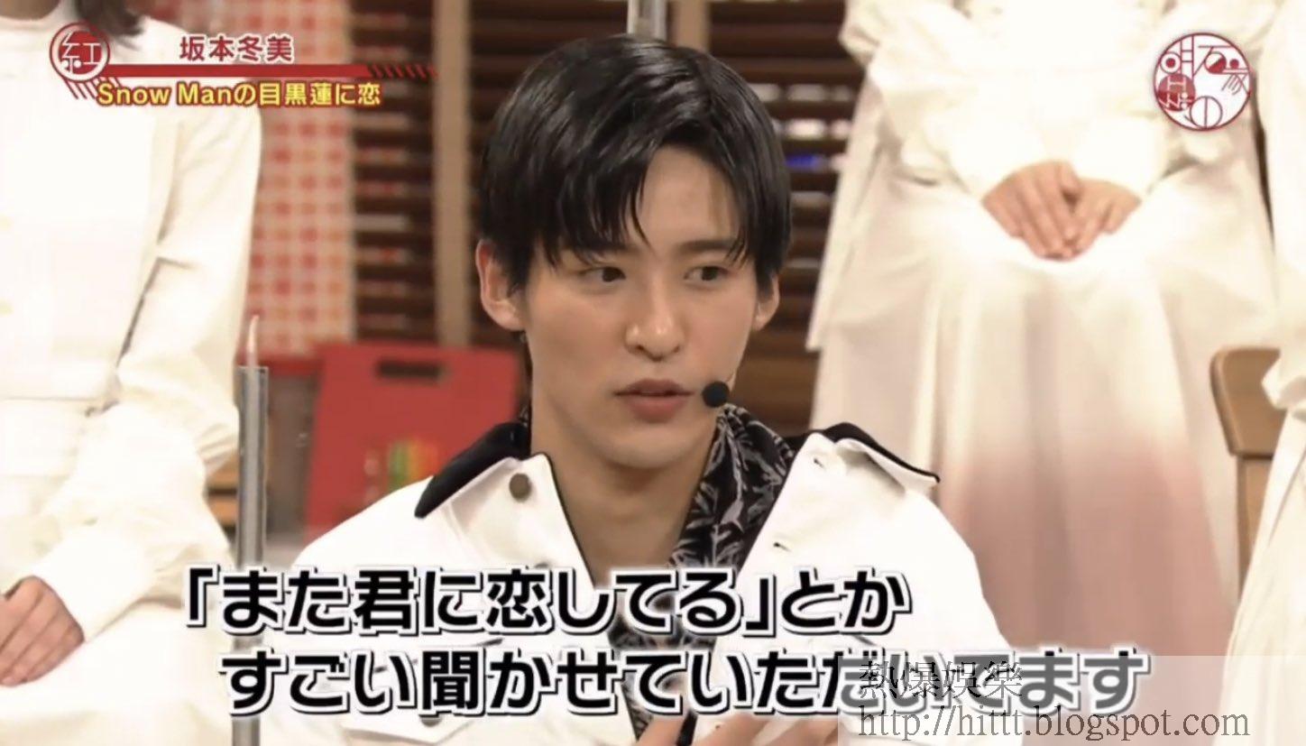 Snow Man日前亮相NHK電視台節目《明石家紅白》,目黑蓮被演歌界天后坂本冬美公開示愛,坂本冬美更大讚目黑是繼田原俊彥後,第二位令她覺得可愛又心動的男性,不過目黑蓮透露母親現年48歲,令53歲的坂本冬美大受打擊。
