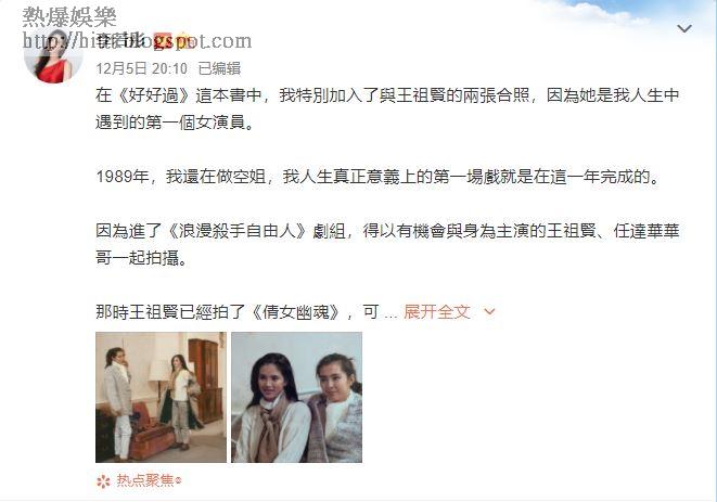 昨晚,李若彤在微博貼了兩張與王祖賢的合照,照片中的李若彤是23歲,而王祖賢是22歲,兩位的外貌都青澀散發仙氣,二人合照的表情有點拘謹,她表示王祖賢是她入行遇到的第一個女演員,大讚已走紅的王祖賢沒有架子,提到當年合作的經過:「1989年,我還在做空姐,我人生真正意義上的第一場戲就是在這一年完成的。因為進了《浪漫殺手自由人》劇組,得以有機會與身為主演的王祖賢、任達華華哥一起拍攝。那時王祖賢已經拍了《倩女幽魂》,可她本人卻絲毫沒有架子,待人也非常友善,我們甚至也會在休息時一起聊聊天。一晃已經三十一年過去,當時的情景卻依然歷歷在目。」
