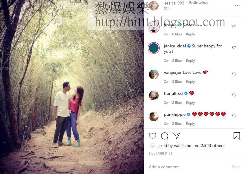 直至本月13日,嘉姐在社交網貼合照打卡放閃:「一場嚟到,影張lor。 #人人打卡我又打」兩人在樹蔭下甜蜜對望,十分浪漫,多位歌手和DJ都留言恭喜,衛詩:「Wooohooo!! Love is in the air 」、少爺占讚sweet,衛蘭、許廷鏗、周柏豪等都給心心圖案,最搞笑是何韻詩留言問:「條路好唔好行?」嘉姐回覆:「驟眼以為你問條佬好唔好行?落山難過上,最緊要着對好啲嘅鞋防跣。」