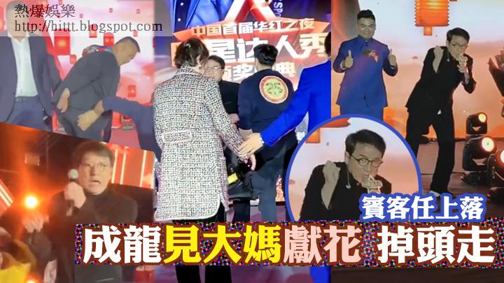 唱到尾聲,藍色西裝友又嚟料,拖住一位大媽fans上台,正當大媽準備獻花之際,成龍咁啱唱完,即頭也不回轉身離開,搞到大媽只好望住成龍離開,相當面懵。