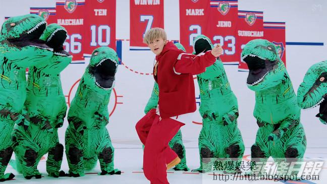 在《90’s Love》MV當中,有一幕是成員在室內場館跳舞Battle,背後有幾個穿上吹氣恐龍服裝的人。本身明明係睇七子晒舞功,但NCT U上星期公開他們親自觀看MV的反應片段時,Winwin自爆後面的吹氣恐龍原來是NCT經理人!早幾日NCT的日常YouTube頻道「채널 NCT DAILY」亦發布了七子全程與「恐龍」共舞的片段,只見幾位經理人十分落力,隨音樂擺動身體,加上綠色的Sharp醒造型,吸睛程度不輸他們平時照顧的偶像。