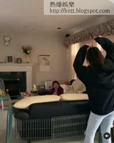 轉眼她已經抵達加拿大的大宅,戴著口罩的她攝手攝腳走進客廳,為婆婆送上驚喜。