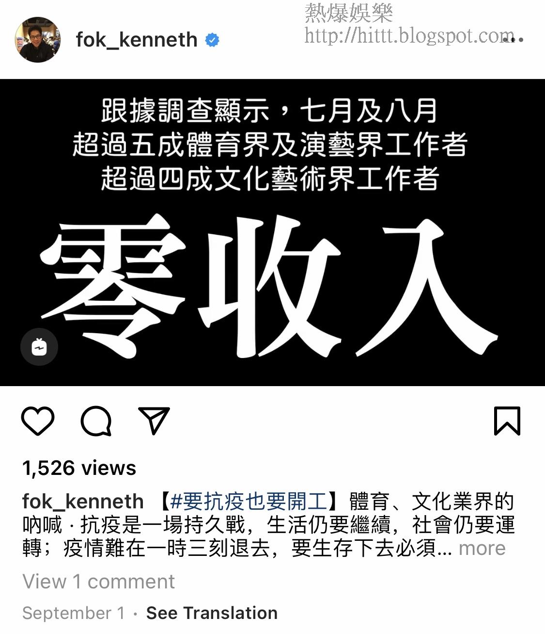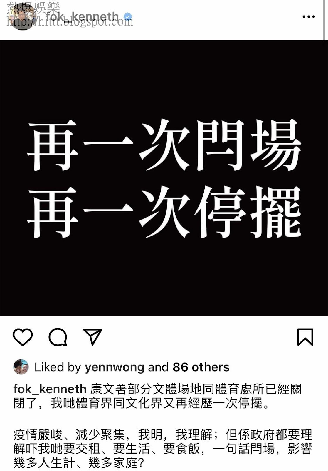 他長文表示收到好多業界求助及查詢,要求政府提供支援,但似乎未有好消息。他字裡行間明顯既無奈又憤怒,但又不能言明。「疫情嚴峻、減少聚集,我明,我理解;但係政府都要理解吓我哋要交租、要生活、要食飯,一句話閂場,影響幾多人生計、幾多家庭?呢幾日一直同政府部門溝通,反映業界朋友難處同不滿,亦要求提供支援俾文體業界;目前唔敢判斷政府反應是否正面,我只希望每一句「明白」、「知道」背後,真係有企喺業界角度諗,真係會幫我哋。」最後更以hashtag 補充,#希望大家都要撐住 #要抗疫也要開工 。