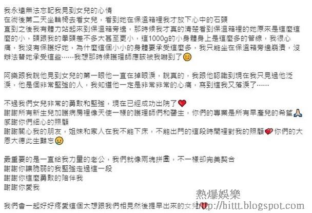 佢續指第1次見到B女時,其體重只有1kg,頭部亦只有1個拳頭大小,身體插滿喉管,令佢兩公婆都極為心痛,又透露一直都好堅強嘅老公都忍唔住一直喊。最後佢多謝家人、朋友嘅關心及照顧,並特別感激老公嘅扶持:「最重要的是一直給我力量的老公,我們就像兩塊拼圖,不一樣卻完美契合,謝謝你讓脆弱的我堅強走過這一段,謝謝你這麼勇敢的陪伴我,謝謝你愛我,我們會一起好好疼愛這個太想跟我們相見然後提早出來的女兒。」