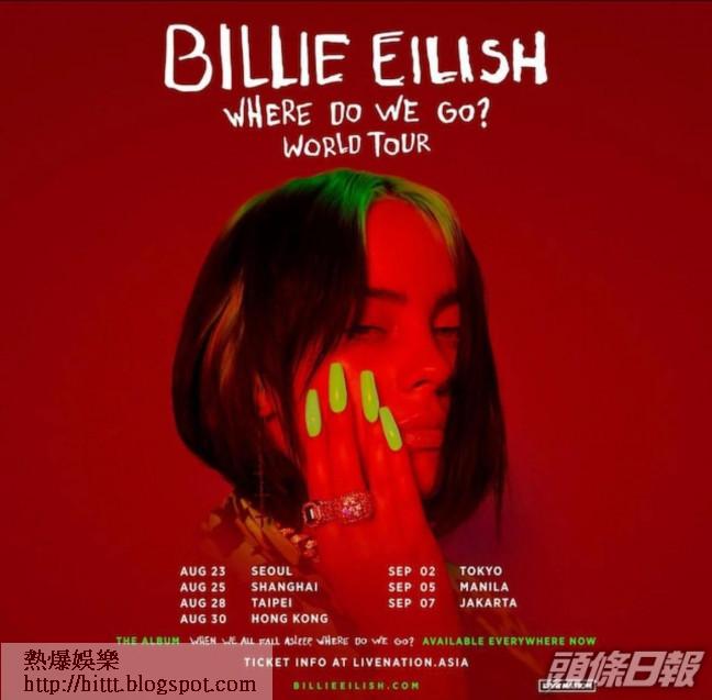 18歲超新星Billie Eilish去年推出《Bad Guy》一曲爆紅,更在今年1月舉行的《第62屆格林美獎》橫掃5獎,包括「最佳新人」、專輯《當我們睡了 怪事發生了》奪「年度專輯」、歌曲《Bad Guy》奪「年度歌曲」等等。今年初她宣布首個世界巡迴演唱會《Billie Eilish Where Do We Go? World Tour》將於8月30日在香港亞洲國際博覽館舉行,旋即掀起香港Fans撲飛。但受疫情影響,今年5月她宣布本年度所有巡唱要延期,原定的香港個唱都要暫停,不過當時主辦單位Live Nation就表示正與巡演單位商討延期安排,落實新的演出日程,同時已購票觀眾可選擇是否退票。
