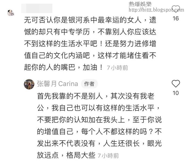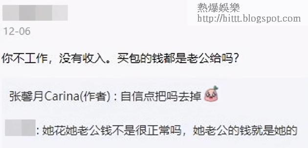 另有人指曾當車模的張馨月只有中專學歷(程度相等於高中),如果單靠她自己,是沒法買得到這麼多名牌手袋,網民諷張馨月的闊太生活都要靠老公提供。張馨月親自上線回覆網民時,否認自己靠老公:「首先我靠的不是別人,其次沒有我老公,我自己也可以有這樣的生活水平,不要把你的認知加在我頭上。」