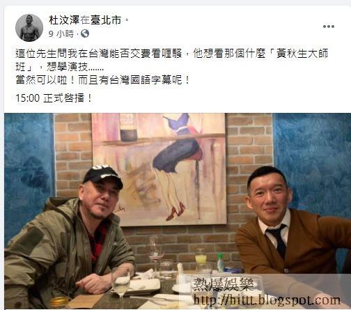 二人同在台灣,當然有相約飯聚,但杜汶澤放合照上facebook時,只留言傳宣秋生在「喱騷」的節目《黃秋生大師班》。