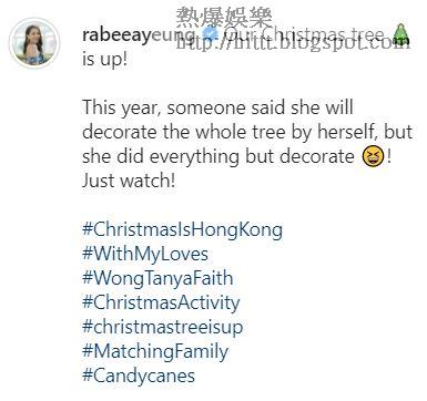 另外,楊洛婷於IG分享家中親子活動片段,她與老公黃天翱(Tim)及3歲大女兒黃子霏(Tanya)身穿聖誕老人睡衣親子裝,一家三口在廳中佈置聖誕樹,帖文「Our Christmas tree is up! This year, someone said she will decorate the whole tree by herself, but she did everything but decorate! Just watch!(我哋聖誕樹已經矗立!今年,有位女孩話要親手佈置成棵聖誕樹,她做了很多事,除了佈置聖誕樹!大家睇片!)」片中,楊洛婷夫婦埋頭苦幹佈置聖誕樹,旁邊的電視更播放壁爐火堆畫面,令家中更添加聖誕氣氛,但Tanya全程沒有參與佈置,中途更拿出唇彩在鏡頭前扮靚,在旁的爸爸Tim則一臉倦容。完成佈置後,楊洛婷邀請一家三口跳聖誕舞慶祝,鬼馬的Tanya卻一支箭跑走,要楊洛婷大叫「返嚟呀!」