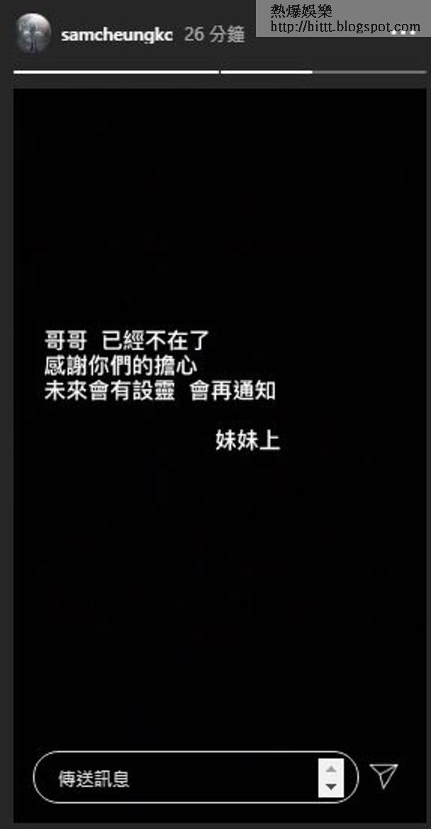 其後,有自稱為死者胞妹在同一個社交媒體帳號留言,指「哥哥已經不在了,感謝你們的擔心,未來會有設靈,會再通知。」東網嘗試聯絡Sam,對方妹妹以whatsapp回覆:「哥哥已經不在了 謝謝關心 妹妹上」另廖慧儀今日以身體不適為由,將不會出席下午舉行的公開活動。