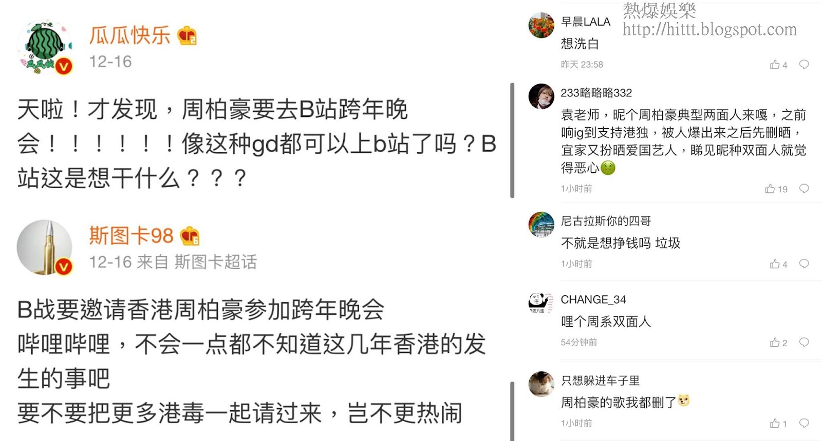 原來周柏豪原定將會出席由大陸影視網「嗶哩嗶哩(bilibili)」與黨媒「央視頻」在12月31日將合辦跨年騷,卻因被小粉紅狙擊指他為「港獨藝人」,以致嗶哩嗶哩在前日(21日)要發出聲明,指將積極配合監管部門指導「掃黃」。