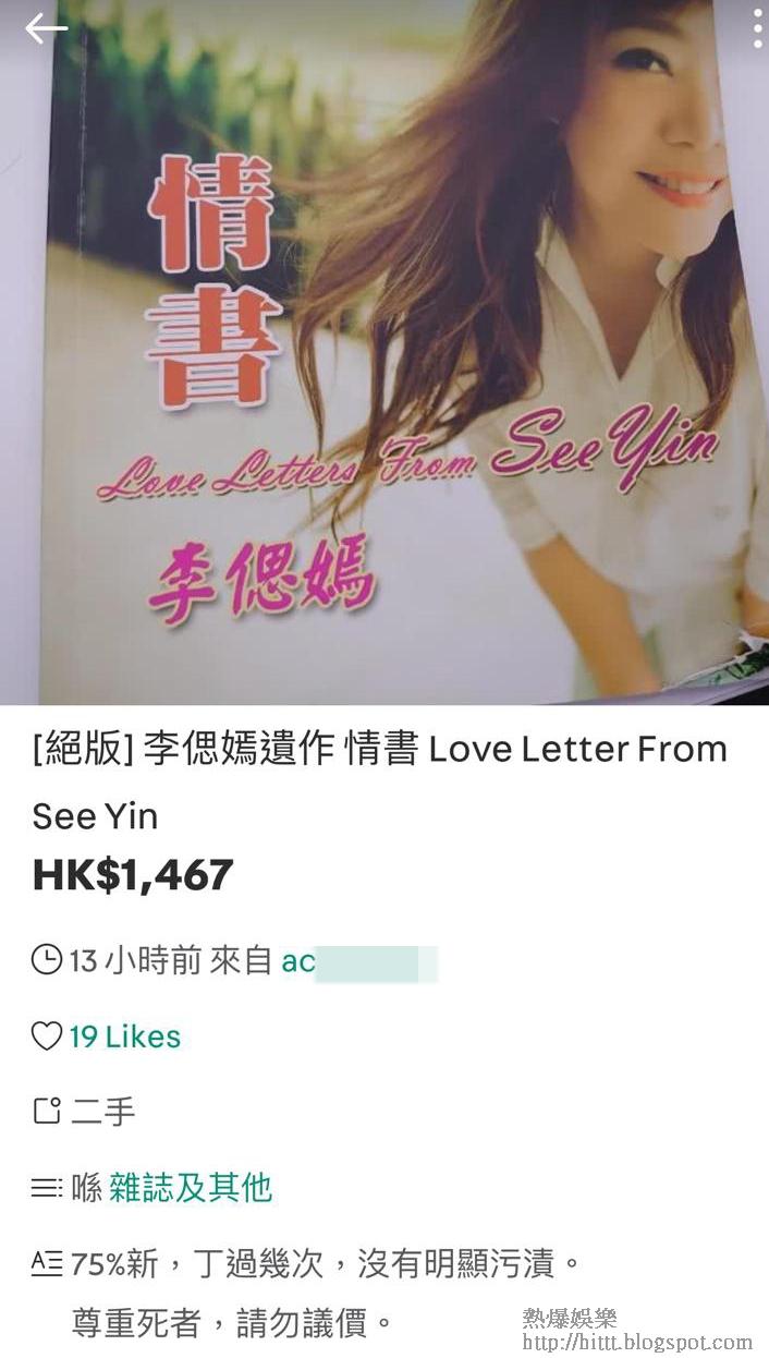 一夜間,李偲嫣的刊物忽然被人掟上網賣,包括絕版扇及《情書》寫真集,見賣家開價幾狼死,由$400至$1467放售,更有一位有趣的買家上網徵書自用收$8,964一本,看來他對私煙BB確是「情比金堅」。