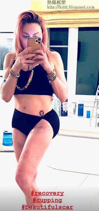 麥當娜昨日換上緊身黑色性感裝束對鏡自拍,展示其大腿上拔罐後留下的圓形痕迹,而左腿上更清晰可見另一條長長的疤痕,未知是否亦是因拔罐造成。在自拍照中,現年62歲的娜姐依然保持着少女身段,未有半點鬆弛,她還風騷留言指身上的是美麗的疤痕。拔罐療法不但在亞洲,於中東和拉丁美洲亦相當盛行,真人騷女星Kim Kardashian、珍妮花雅麗絲頓(Jennifer Aniston)和「碧咸嫂」Victoria Beckham亦曾接受治療。