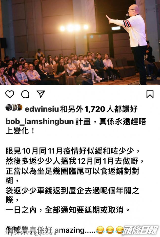 Bob留言︰「計畫,真係永遠趕唔上變化!眼見10月同11月疫情好似緩和咗少少,然後多返少少人搵我12月同1月去做嘢,正當以為坐足幾圈臨尾可以食返鋪對對糊,袋返少少車錢返到屋企去過呢個年關之際,一日之內,全部通知要延期或取消。個感覺真係好amazing.....但係,我同自己講:『內心強大,冇嘢要驚!』同業們,撐住,頂住!」
