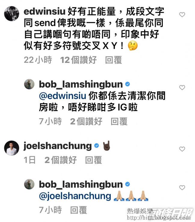 正在隔離營接受14天強制檢疫的蕭正楠,在Bob發文留言︰「好有正能量,成段文字同send俾(畀)我嘅一樣,係最尾你同自己講嗰句有啲唔同,印象中好似有好多符號交叉XY!」Bob回他︰「你都係去清潔你間房啦,唔好睇咁多IG」