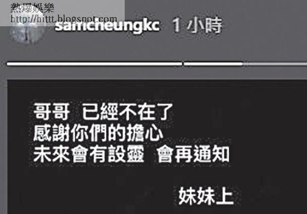 而Sam妹接受傳媒訪問時,表示曾告知廖慧儀噩耗,但對方沒有回覆,她指兄長一直表現消沉,上過天台5、6次,都被她與朋友拉回。她承認難免會怪責廖慧儀,可是愛情之事始終很難說,不可以說100%是她的錯,但最大原因一定是她,只希望哥哥可以安息。