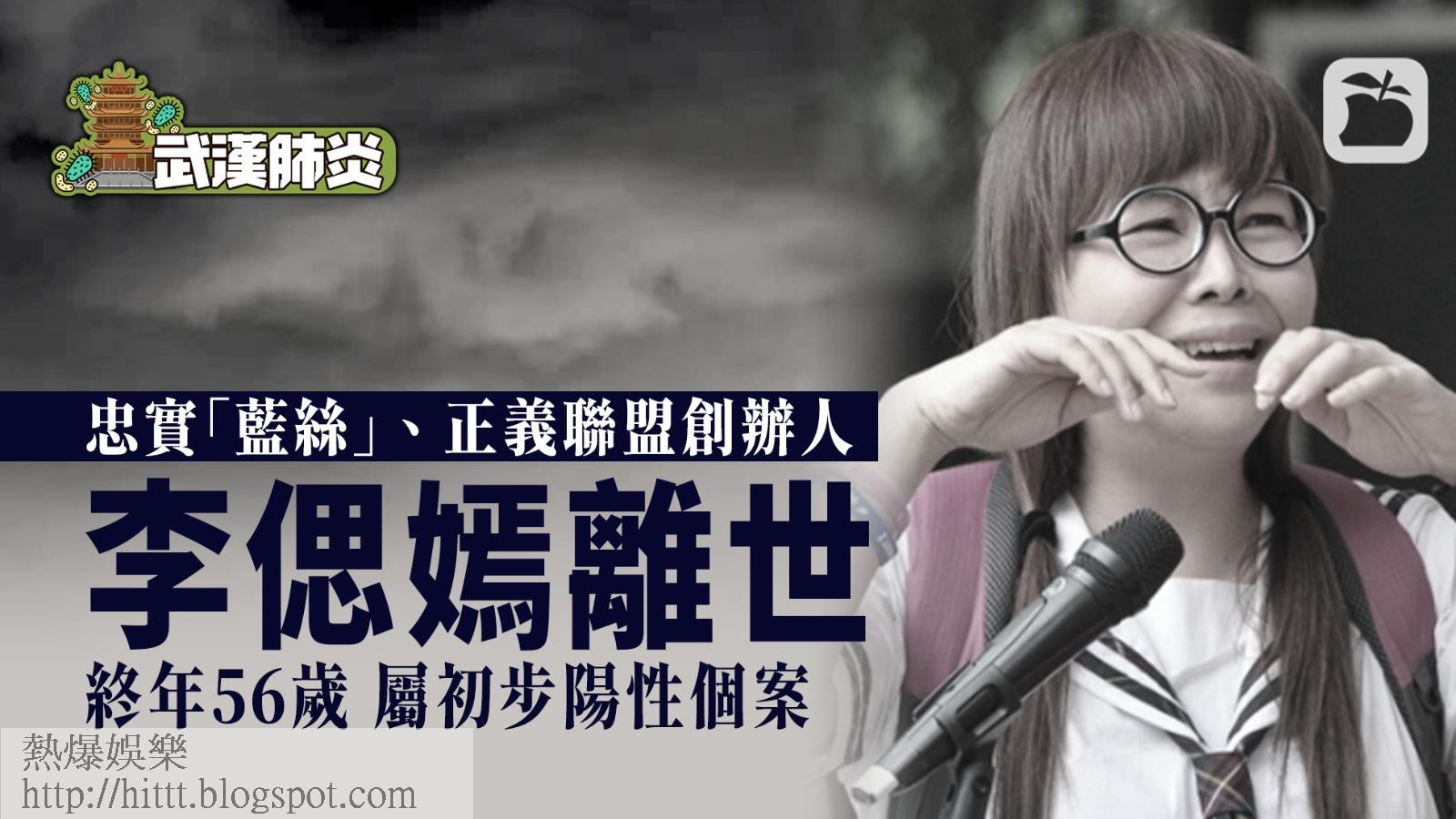 本報從多於一個渠道獲悉,死忠「藍絲」、盲撐梁振英的正義聯盟創辦人李偲嫣已離世。據了解,李偲嫣在救護車到場前,病情已非常差,曾經使用AED機復甦心跳,但效果不明顯,未待入院已證實死亡。院方為她進行武肺測試,發現體內含有武肺病毒,屬初步陽性個案。有指,李偲嫣因為有病徵,同時氣促,今早突然傳呼救護車急救,急救員到場時已發現她病得相當重。醫管局連日來多番提醒市民,不論年紀長幼,只要有輕微不適或任何病徵,應立即求醫,而非靜待病徵自行消退,或服用成藥了事。