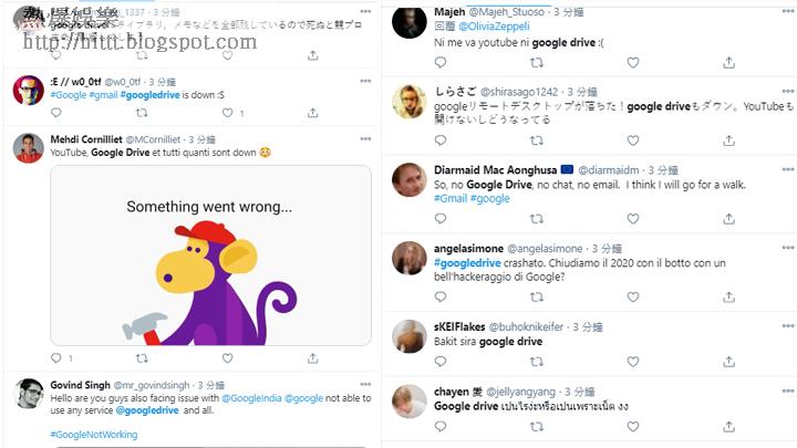 Google多項服務周一突然無法運作,包括雲端文件、Gmail、Youtube、Chrome遠端桌面(Remote desktop)、Google Playstore及Google新聞突然死機,全球網民在Twitter紛紛發文求救,目前異常原因未明。