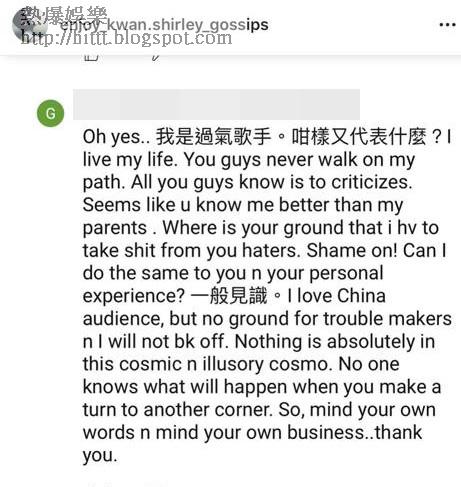 Shirley如此強硬措詞,免不了又會觸碰小粉紅的弱小心靈,結果和小粉紅在微博一輪舌劍唇槍下,Shirley在去年5月憤而棄用微博。此後其發文便以IG為「家」,間中分享舊照,不過在自己的領域上,她依然不時受大陸小粉紅翻牆狙擊。今日她終於打破緘默,留長文反擊小粉紅。她以中英文夾雜說:「係呀,我係過氣歌手,咁樣又點呢?代表啲乜?我有我生活,你哋永遠唔會同我同路,你哋只係一味批評,好似你哋了解我仲多過我父母。」Shirley指自己愛錫大陸fans,但絕非喜愛一班麻煩製造者。她說:「我係唔會退縮,唔該你哋顧掂自己啲事同小心講嘢嘅用詞。」