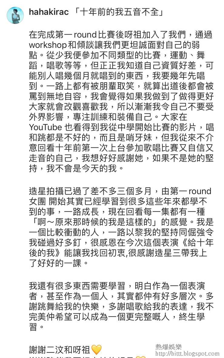 ViuTV真人騷《全民造星III》已經進入第三階段,距離總決賽舉行的日子亦越來越接近,組員之間對戰明比過往精采,在昨晩播出的第25集,A3組的葉巧琳、陳葦璇(前女子歌唱組合As One成員陳嘉茵)、顧定軒(Zeno)、麥詠楠(Buber)和林詠倫(Alan)表演《給十年後的我》,不單令評判大為感動,其後在網上亦有不少讚美的聲音。在今次的演出,他們每人手執一個布偶,他們用10年前的相片做序幕,分享10年前後的人生經歷,雖然舞台設計簡單,他們亦沒有花巧的表演,不過這最真面,反而最觸動人心。