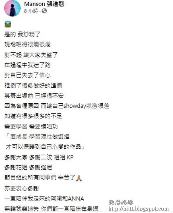 凌晨他在社交網發文,承認做得不好,失去了信心:「是的,我炒粉了,現場唱得很爛很爛,對不起,讓大家失望了,在過程中我迷了路,對自己失去了信心,推倒了很多做好的準備,其實出場前已經很不安,因為各種原因,而讓自己showday狀態很差,知道有很多很多的不足,需要學習需要練唱功,『要成長,學習理性做選擇,才可以保護到自己心愛的作品』。」最後他多謝大家支持,表示會繼續努力做好創作期待帶新作品給大家!