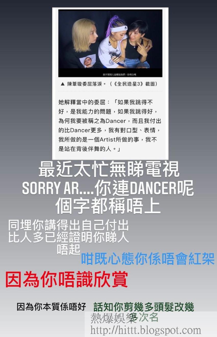 誰知言論一出,陳葦璇即被舞蹈界及網民圍攻,認為其實最看不起Dancer的就是她自己,更紛紛湧到她的IG下留言,「DANCER=舞者,請不要妄自菲薄,要人尊重你,首先你要尊重同proud of 自己先!你自己都睇唔起dancer,邊個會睇起你」、「咩叫後面嗰啲?完全唔識尊重dancer 仲要扮曬野扮可憐博同情?唔好啦~」