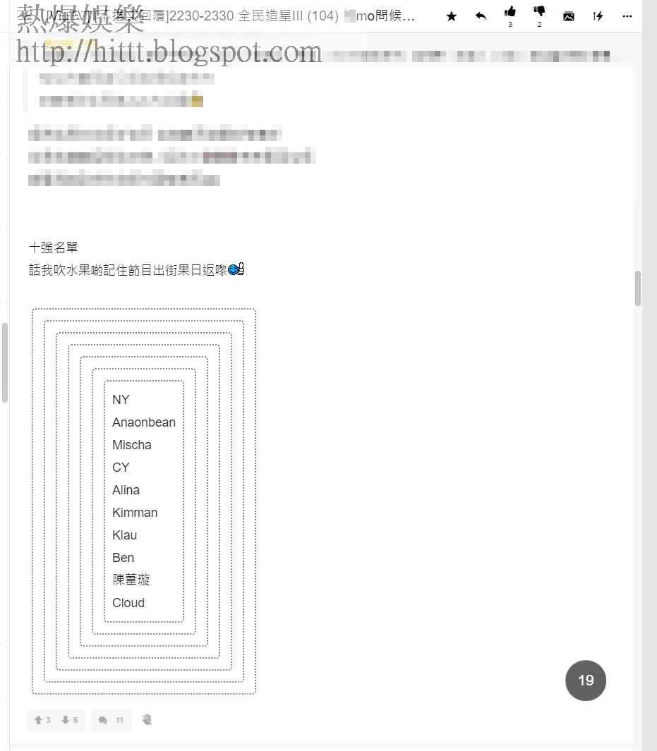 據了解《造星III》的10強名單將於18日公佈,甚至獎項的安排亦稍後才會公佈,不過近日在連登討論區流傳了一份十強名單,成功進入十強的人包括:NY、ANSONBEAN、葉巧琳、CY、Alina、Kimman、KLau、Ben、陳葦璇及Cloud,反而一直被傳是內定冠軍兼花姐契仔的Timo(江宏基)榜上無名,有網民估計Timo受近日負評與及節目內寸爆的表現所拖累。當然有不少網民又質疑名單的真偽,更有人留言切勿「跟車太貼」,但出post的網民留言:「話我吹水嗰啲,記住節目出街嗰日返嚟!」