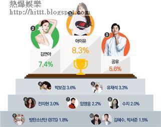 全智賢跟去年一樣,一直保持在第六名,不過神劇《太陽的後裔》女星宋慧喬今年就被踢出榜,而今年憑人氣劇《愛的迫降》上位的玄彬及孫藝珍,竟榜上無名。