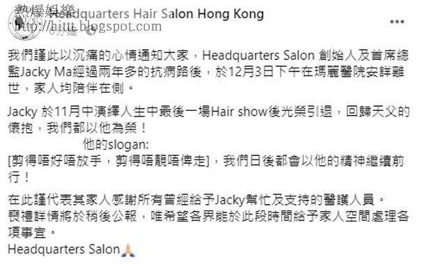 今日,其任職多時的髮型屋於社交網發出公告:「我們謹此以沉痛的心情通知大家,Headquarters Salon 創始人及首席總監Jacky Ma經過兩年多的抗病路後,於12月3日下午在瑪麗醫院安詳離世,家人均陪伴在側。Jacky 於11月中演繹人生中最後一場Hair show後光榮引退,回歸天父的懷抱,我們都以他為榮!」又提到Jacky的金句「剪得唔好唔放手,剪得唔靚唔畀走」,指日後都會以他的精神繼續前行。另外,明星御用髮型師Kim Robinson識英雄重英雄,亦有留言悼念。