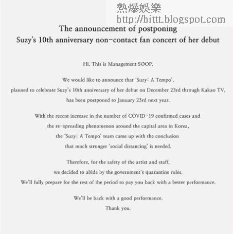 至於「國民初戀」秀智原定於下周三透過kakao tv進行網上直播fans見面會《Suzy: A Tempo》,與fans共賀出道十周年,但受到疫情影響,事務所今日宣佈見面會將會延期至下月23日舉行,將以更精采的舞台報答fans。