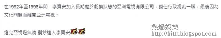 另外,又有網民暗示李寶安「腳頭唔好」:「『在1992年至1996年間,李寶安加入長期處於虧損狀態的亞洲電視有限公司,委任行政總裁一職,最後因為文化問題而離開亞洲電視。』燈完亞視燈無綫,攬炒達人李寶安,整死完亞視而家終於到無綫。」