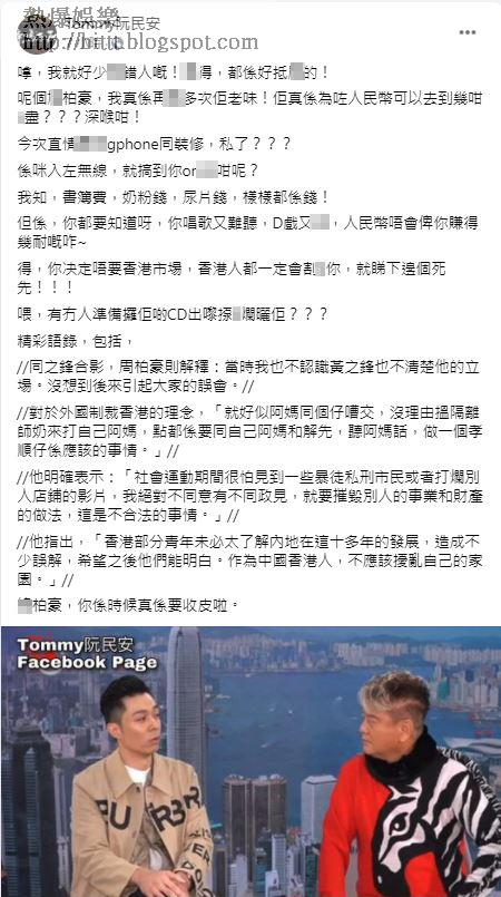 周柏豪昨日在節目分享其修身齊家愛港愛國理念,情操「高尚」,字字「珠璣」,表忠毫無懸念,引來一眾網民洗板式狙擊,就連多次為公義發聲的藝人阮民安,忍不住在facebook留言爆粗:「佢真係為咗人民幣可以去到幾咁盡?深喉咁!係咪入咗無綫,就搞到你OnXX咁呢?我知,書簿費、奶粉錢、尿片錢,樣樣都係錢!但係你都要知道呀,你唱歌又難聽,啲戲又X,人民幣唔會畀你賺得幾耐嘅咋!得,你决定唔要香港市場,香港人都一定會割X你,就睇吓邊個死先!喂,有冇人準備攞佢啲CD出嚟揼X爛晒佢?X柏豪,你係時候真係要收X啦。」