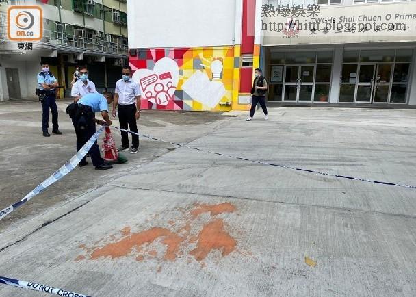 校外地面留有大攤橙色液體。(曾志恒攝)大圍美林邨東華三院蔡榮星小學一名小學女生,今早(22日)8時02分,在返學途中,在校門外遭1名男子淋潑橙色液體, ...