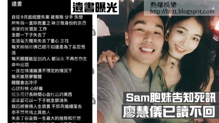 Sam的遺言曝光,一字一句充滿絕望。落選港姐廖慧儀舊受Sam臨死前於電腦留下千字遺書,內容全都圍繞廖慧儀,一字一句表現出失去最愛、生無可戀的情感。遺書 ...