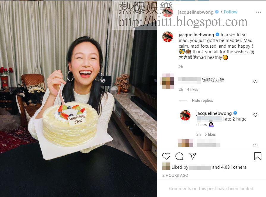 黃心穎剛剛在IG貼出一張捧着生日蛋糕的照片,並留言指在這個瘋狂的世界中要做一個瘋狂的人「 Mad calm, mad focused, and mad happy! thank you all for the wishes,祝大家繼續mad heathly」,只見相中正拿着刀切蛋糕的她笑到「見牙唔見眼」,更透露自己吃了2件蛋糕,似乎已將解約煩惱拋諸腦後。