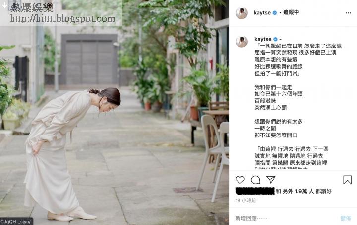 43歲的謝安琪(Kay),出道16年,3年前加盟麥浚龍(Juno)旗下的幻國文化娛樂,早前Kay約滿「幻國文化」並證實離巢一事。日前,她在IG抒發感受,除引用歌曲《3/8》歌詞,並留言:「我和你們一起走,如今已第十六個年頭,百般滋味,突然湧上心頭,想跟你們說的有太多,一時之間,卻不知要怎麼開口。」答謝歌迷多年來的支持。